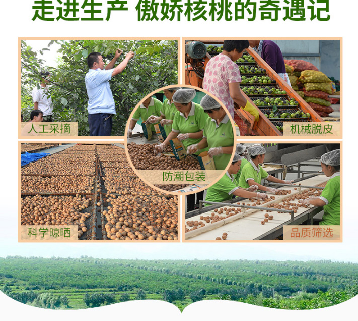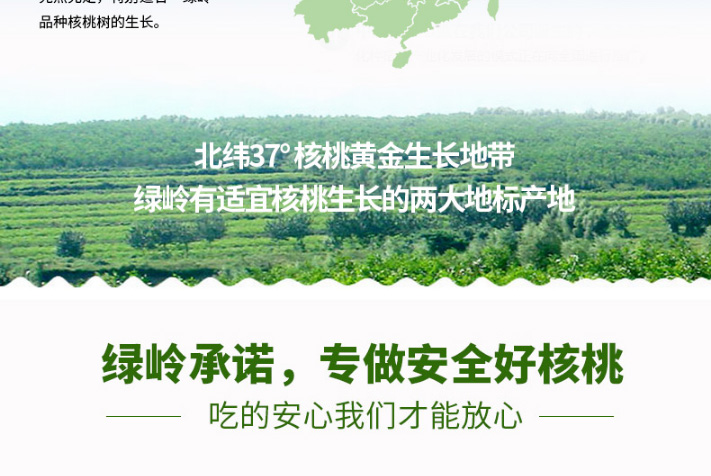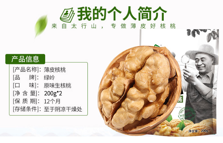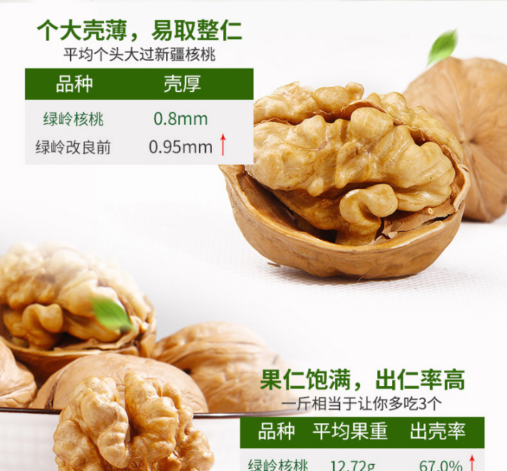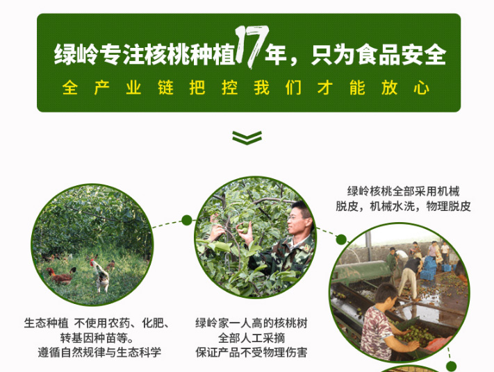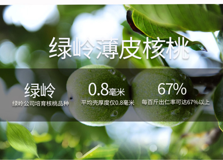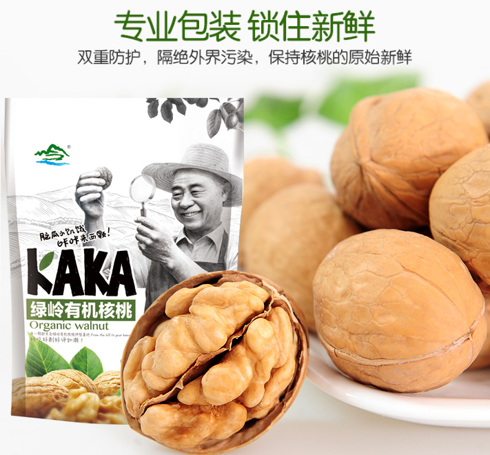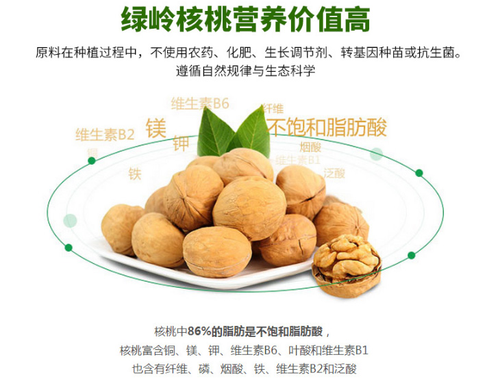產品簡介:綠嶺核桃,皮薄仁飽、養生養腦。采用樹草牧沼生態種植,杜絕使用化肥農藥,每顆都蘊含著大自然的靈氣,獲得了中國和歐盟雙重有機認證。