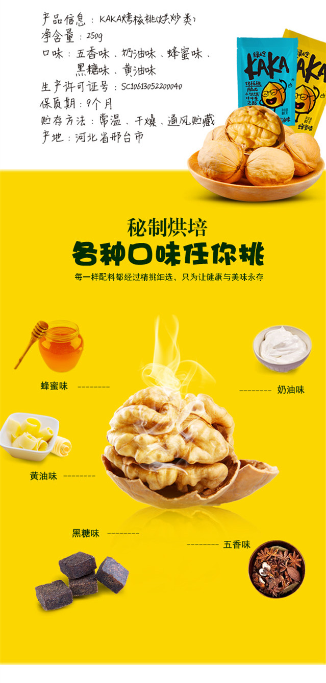 產(chǎn)品簡介:KAKA烤核桃,采用綠嶺有機(jī)核桃為原料,使用宮廷秘制配方和轉(zhuǎn)爐工藝,經(jīng)過24小時低溫烘烤,讓原本就美味的核桃,顆顆入味;讓人吃起來不想停,吃過后還想吃,充分享受皇家貴族之尊味。